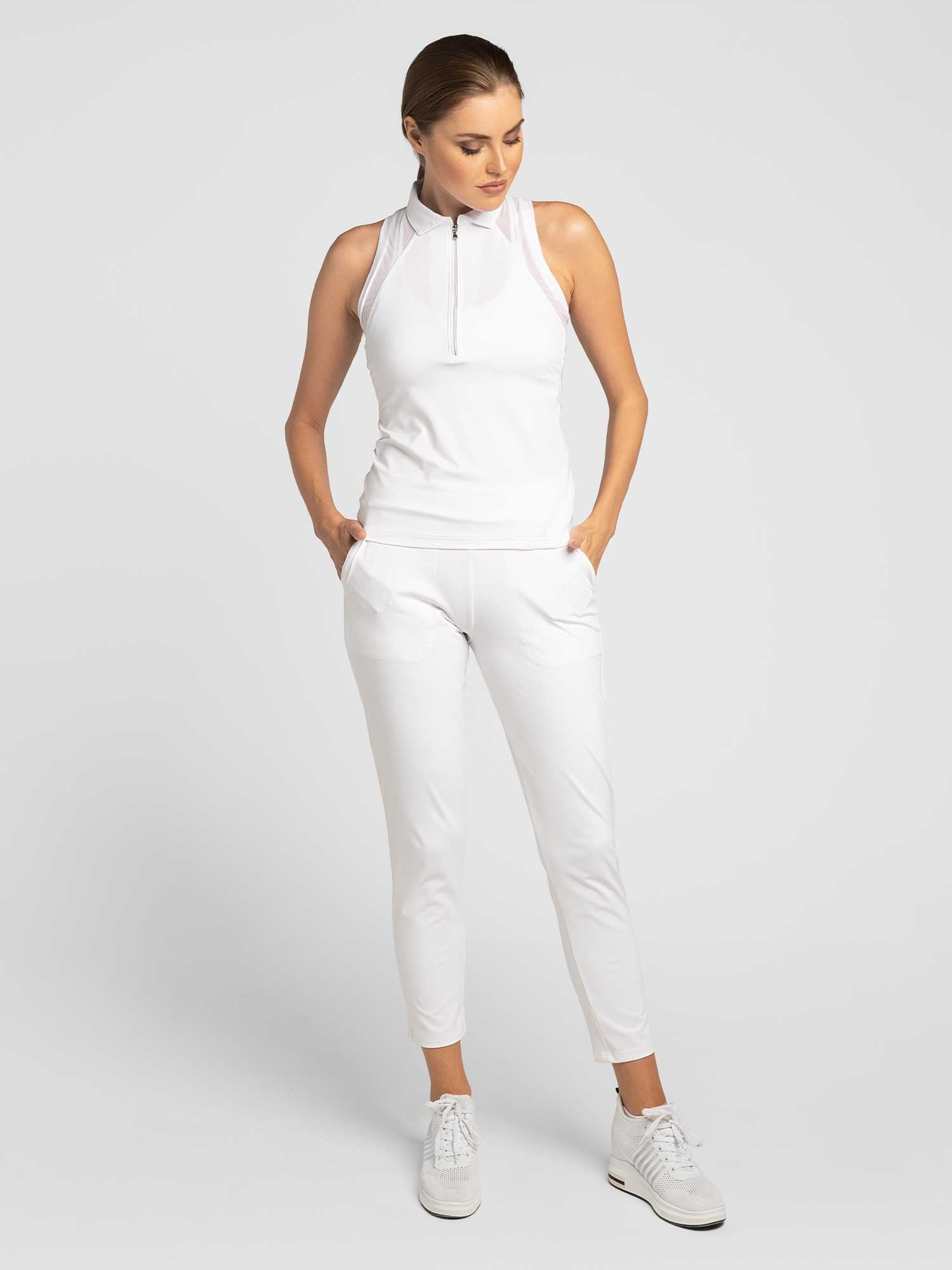Fitted Women's Golf Pants - made from durable water repellent, moisture management technical fabric that keeps you comfortable and stylish. This modern update to the classic pants comes in 28" inseam that's not too long or too short for most golfers. It features 2 front pockets and a back zip pocket that keeps more than your scorecard, glove and phone secured. We paired this with our Pique Neisha Polo Tank for the ultimate country club style!