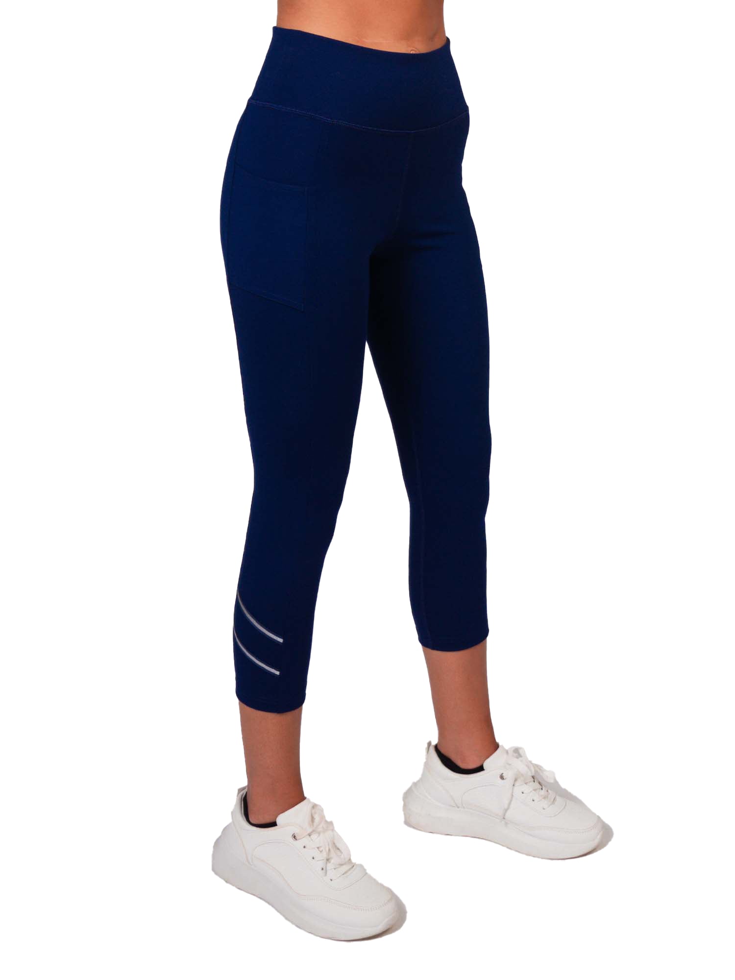 Women's Active Capri Legging - An updated to our high-waisted no sheer best selling compression capri leggings that are made from double knit grin-through reduction fabric with high waist band and side pockets. Ultra comfortable, moisture wicking, breathable compression that perfectly forms to your body. This style features stylish stretch tape with silver reflective line around the lower leg that is the signature of this collection. FittedUPF 50+Inseam: 9" inseam size "S" - - grades 1/2" between sizesMoisture ManagementFourway stretch77% Nylon, 23% SpandexTwo front pocketsOne back pocketMachine Washable